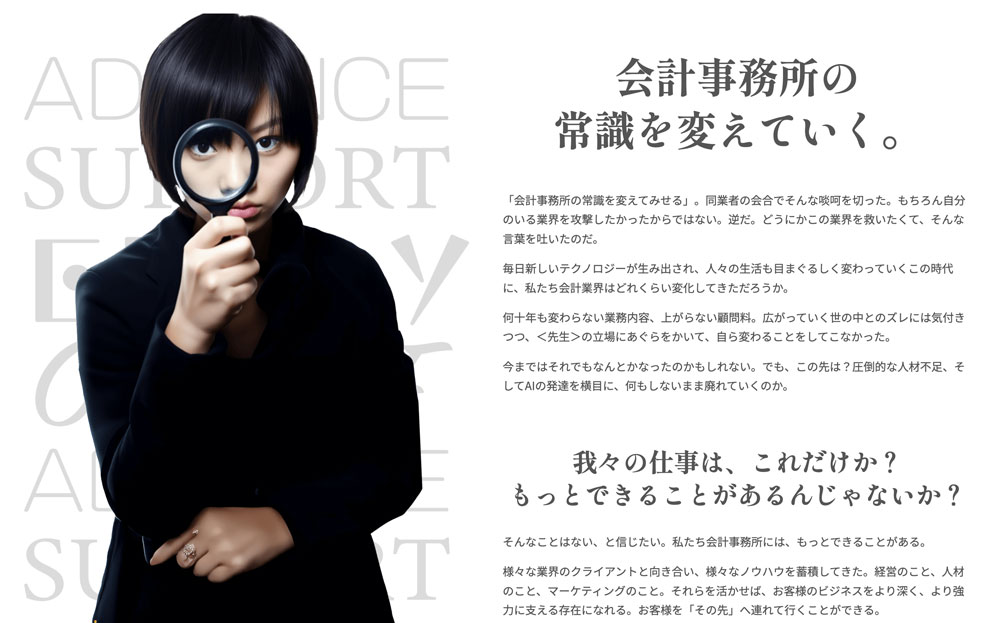 新代表の就任・事業所移転のタイミングに合わせ、Webサイトの全面リニューアルを実施。「会計事務所の常識を変えていく。」という強いメッセージを掲げ、会計事務所の本当の価値を発信するサイトへと生まれ変わった。