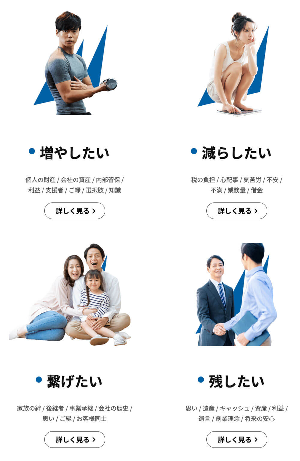 サービス内容を羅列するだけでなく、ユーザーが自分の要望に応じてサービスを選べる「目的から探す」ページを追加。ユーモアを感じるビジュアルを使うことで、身近で親しみを持てる会社だということをアピールしています。