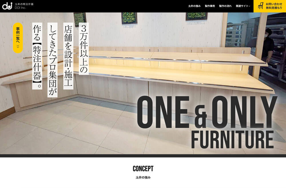 店舗設計・施工の中で付随業務として行っていた「オリジナル什器作成」を本格的に事業化。企業サイト同様、施工事例をメインコンテンツに位置づけ、これまで作成したオリジナル什器を多数掲載しています。